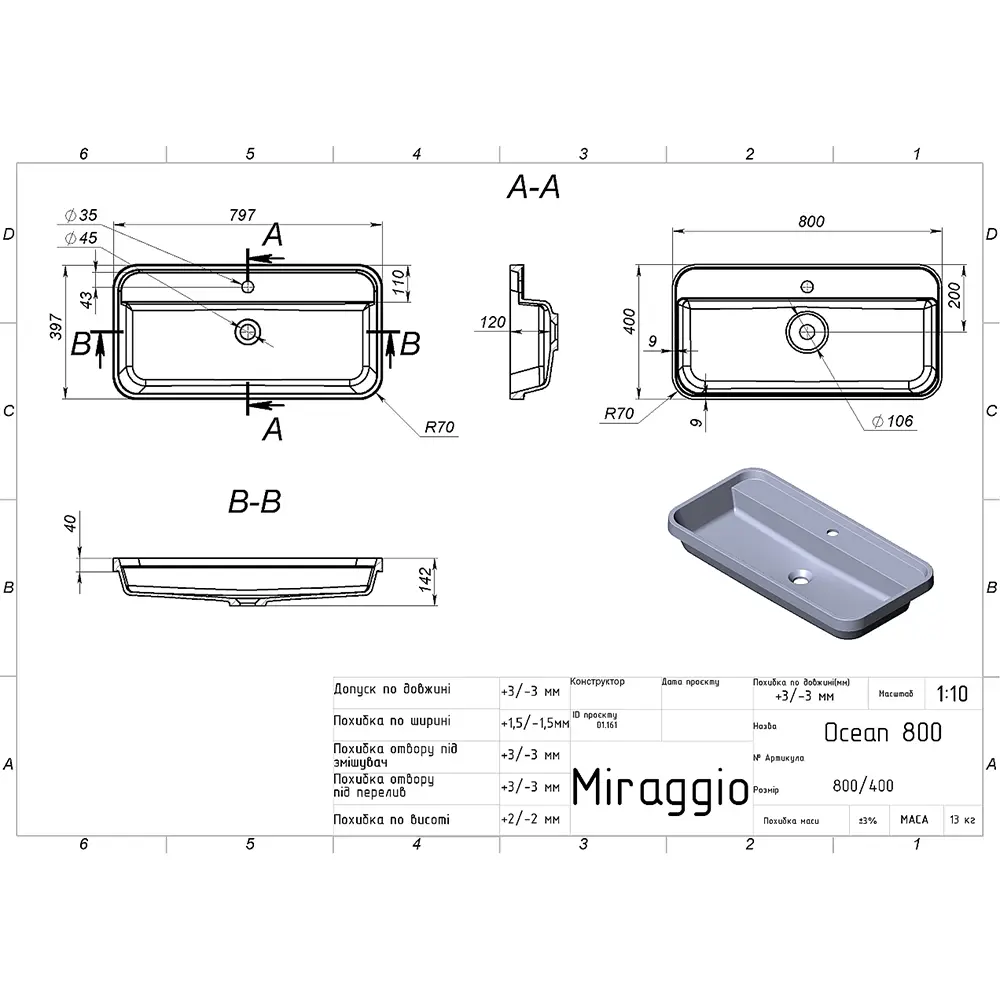 Умивальник врізний Miraggio Ocean 800×400 прямокутний, білий