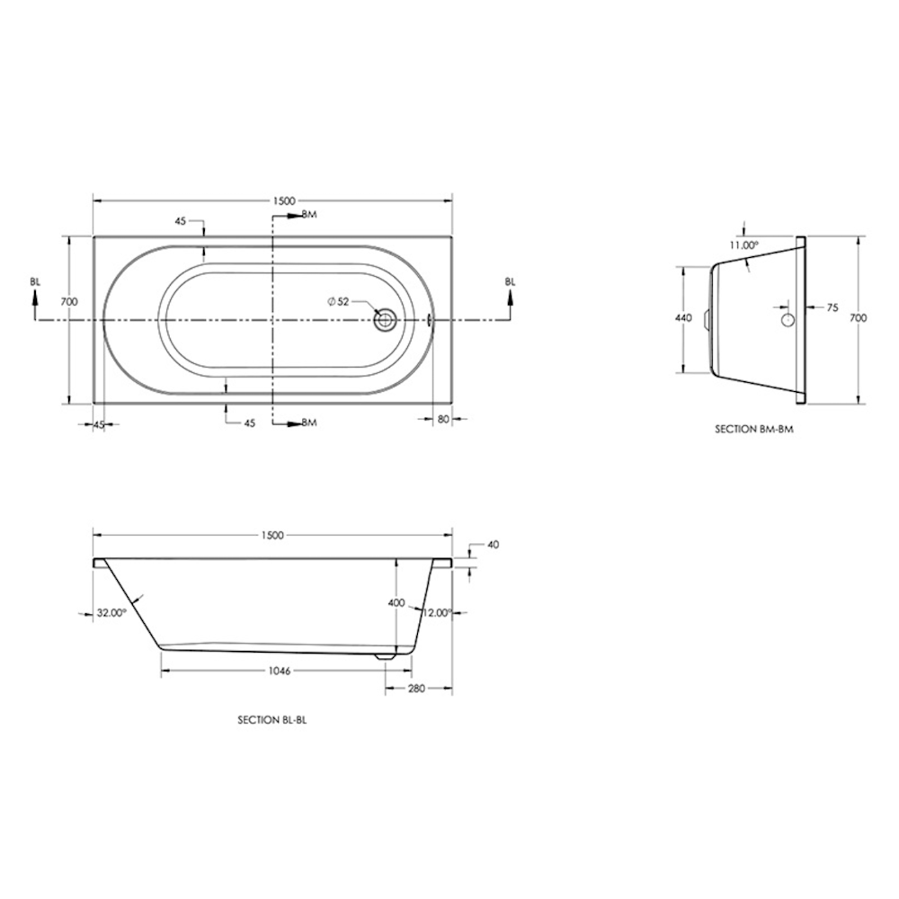 Ванна акрилова HES Evo 1500х700 прямокутна, біла + ніжки (HEV15070W)