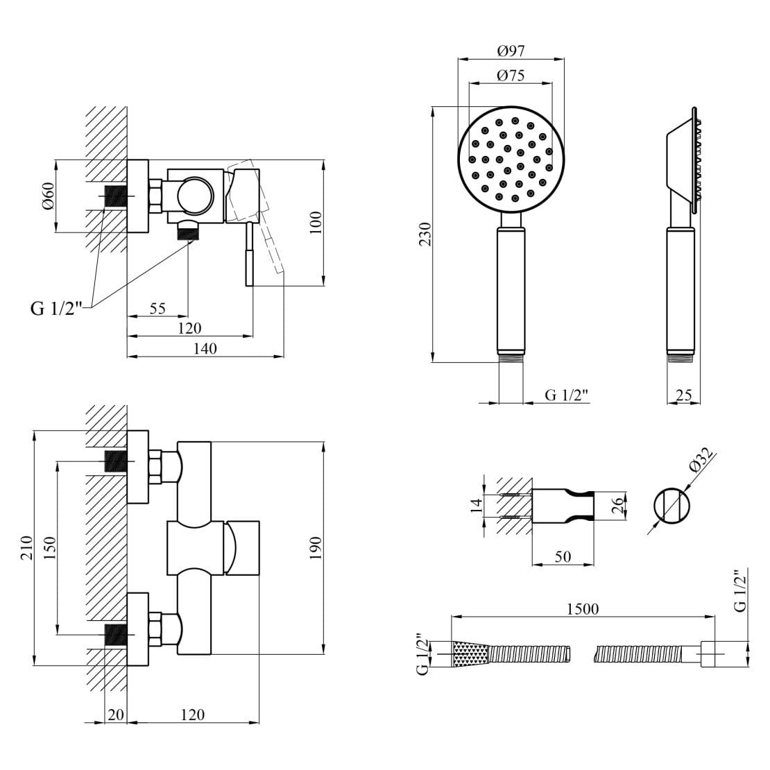 | Комплектація | Душовий шланг, Змішувач, Інструкція, кріплення, Лейка для ручного душу, Тримач ручної лійки |
