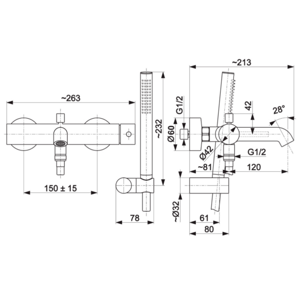Комплектація | Змішувач для ванни, Ручний душ, Тримач для душу |